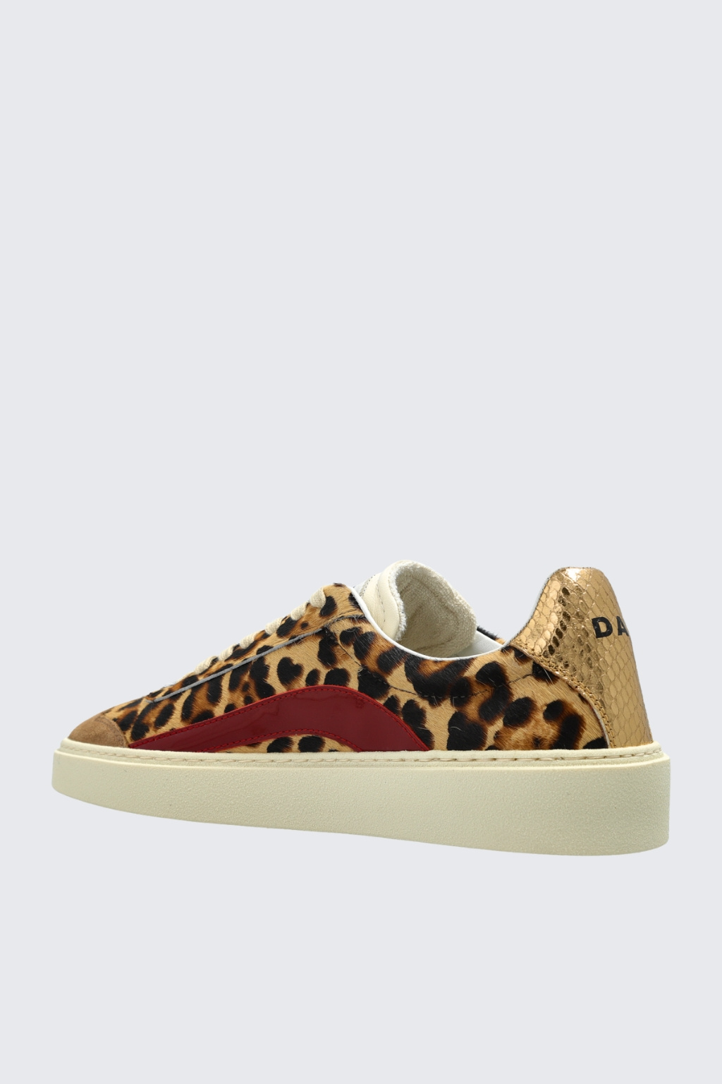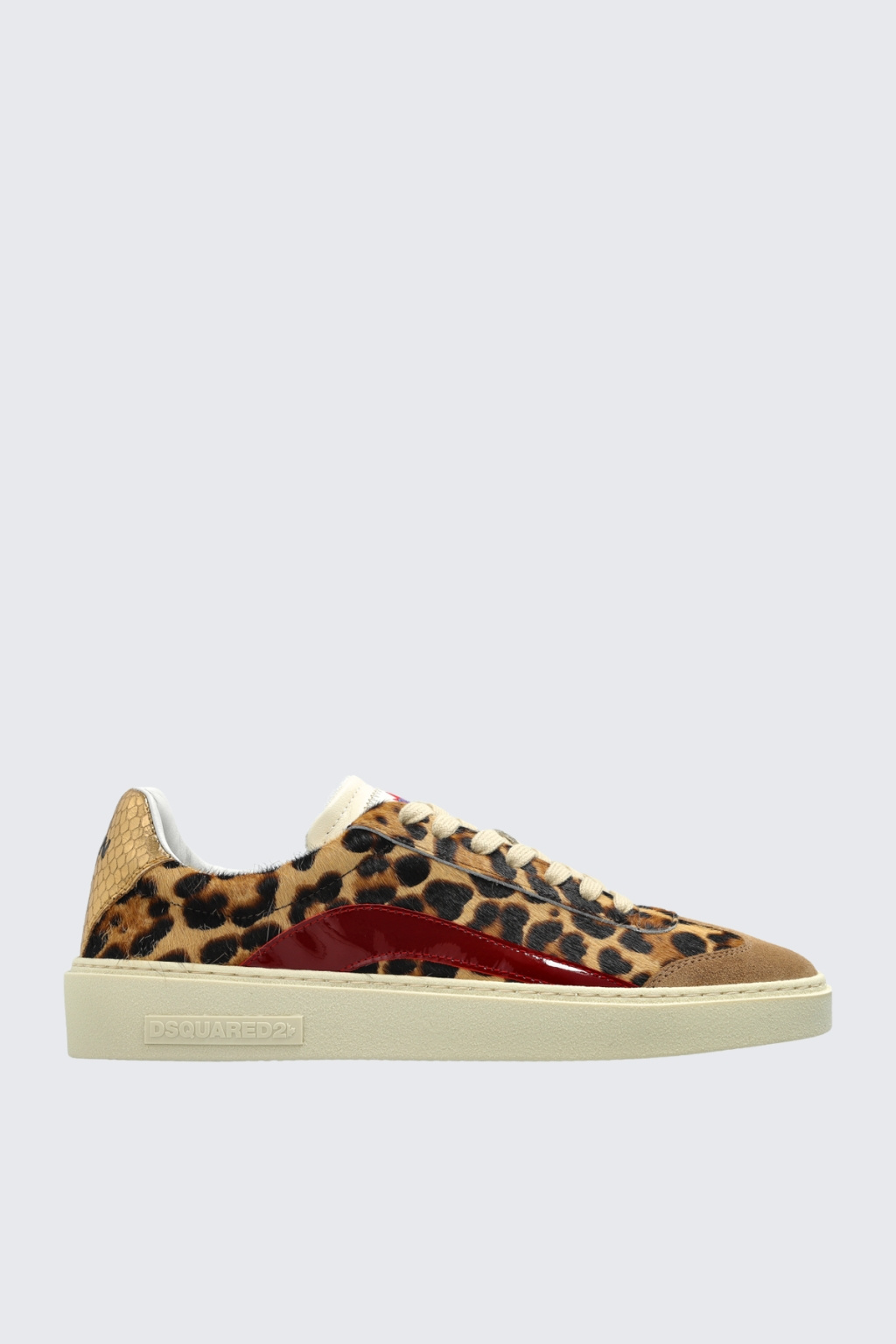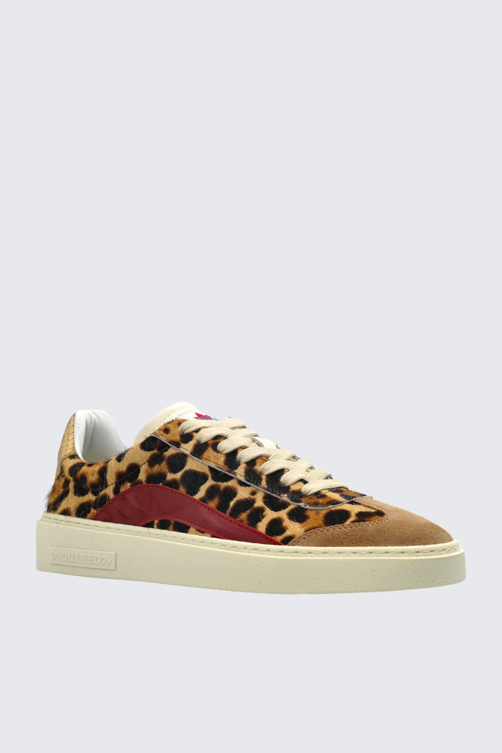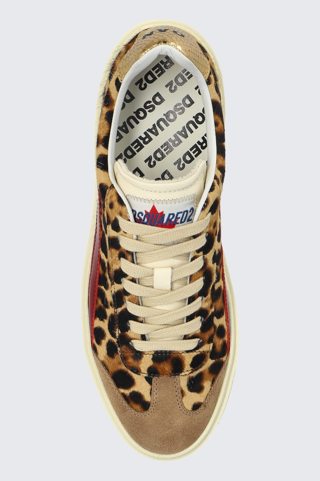 Dámské tenisky značky DSQUARED2 mají kulatou špičku a vyztuženou patu. Boty jsou zvířecího motivu s barevnými prvky. Na platformě je z vnější strany nápis DSQUARED2. Po stranách jsou červené pruhy a na patě metalický dekor s nápisem DAN a na druhé botě DEAN. Na jazyku je nápis DSQUARED2 s logem javorového listu. Boty mají zavazování na ploché, bílé tkaničky.