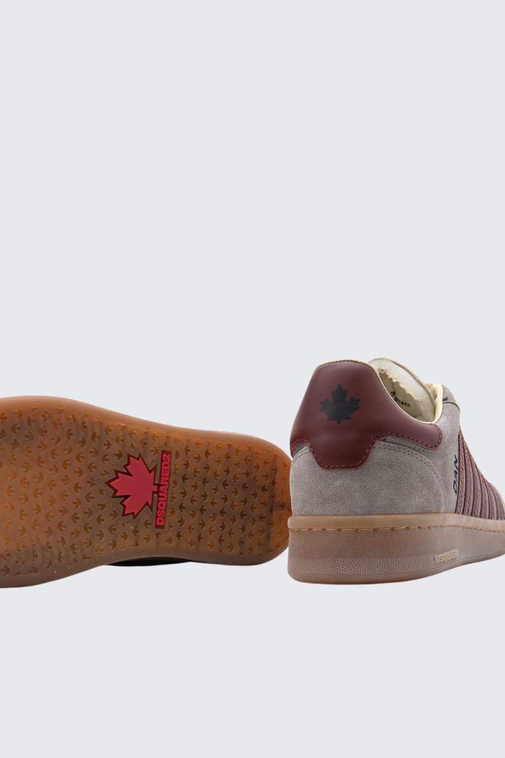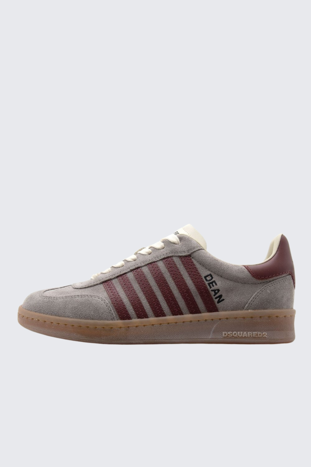 Dámské tenisky značky DSQUARED2 mají kulatou špičku a vyztuženou patu. Na platformě je z vnější strany nápis DAN a z vnitřní DEAN. Po stranách jsou vínové pruhy. Na jazyku je nápis DSQUARED2 a na patě je černé, ikonické logo značky DSQUARED2 ve tvaru javorového listu. Boty mají zavazování na ploché, bílé tkaničky.