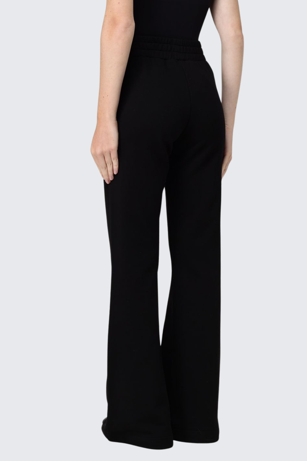 Dámské tepláky značky PINKO mají dlouhé zvonové, široké nohavice. V pase je elastická manžeta a po stranách dvě průhmatové kapsy. Pod levou kapsou je doplněno kontrastní logo značky PINKO.