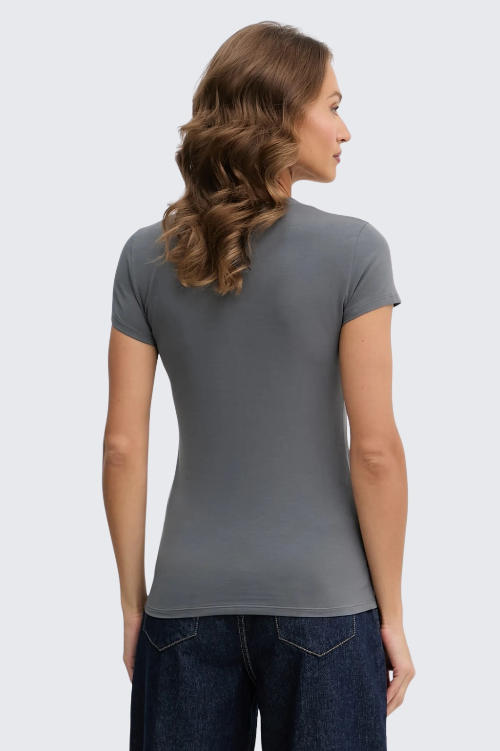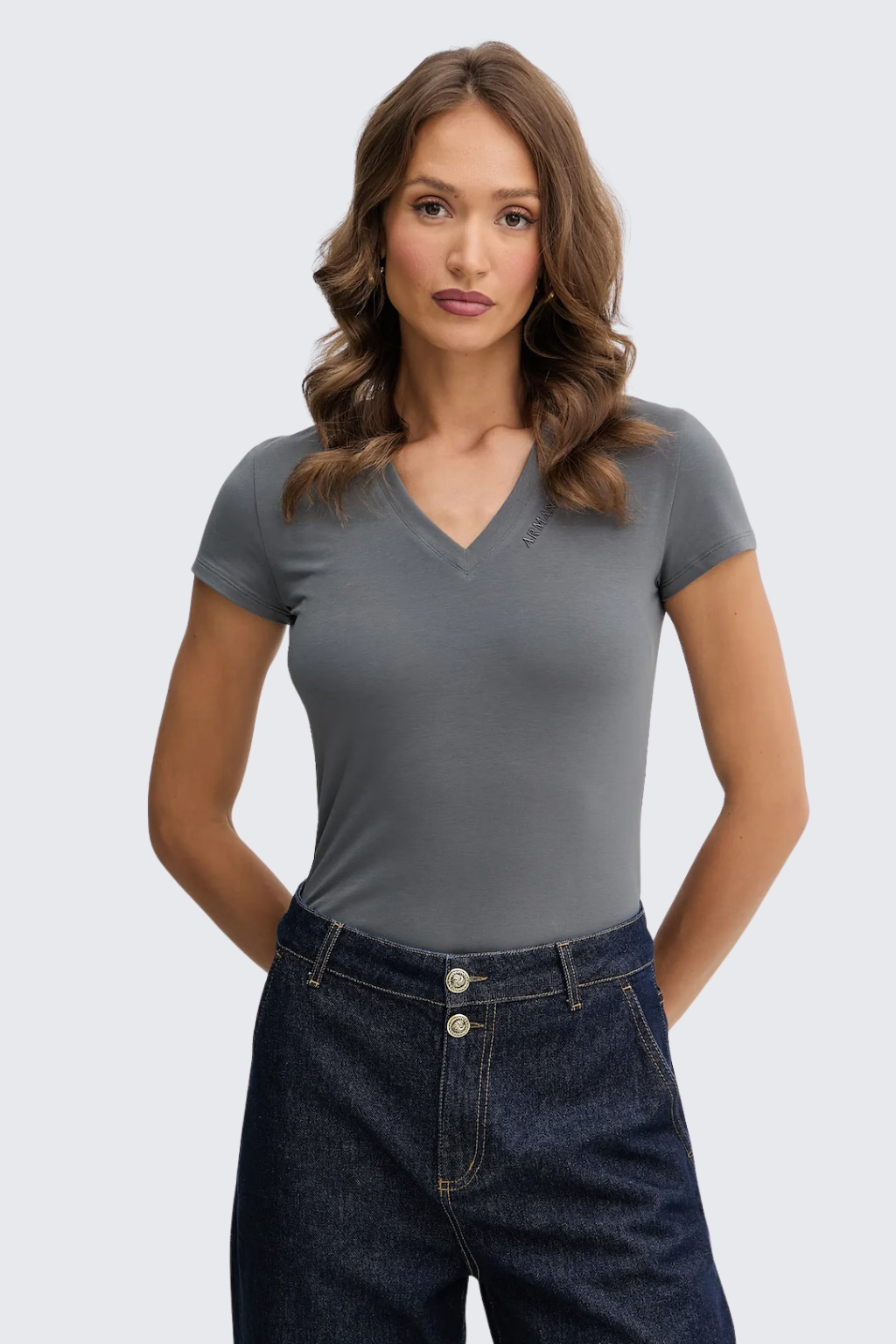 Dámské tričko značky Armani Exchange má přiléhavý střih, krátké rukávy a standardní délku. Model má véčkový výstřih a podél něj je doplněný nápis značky Armani Exchange.