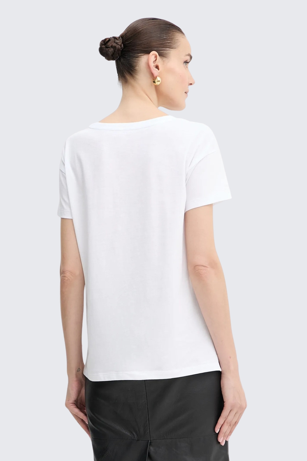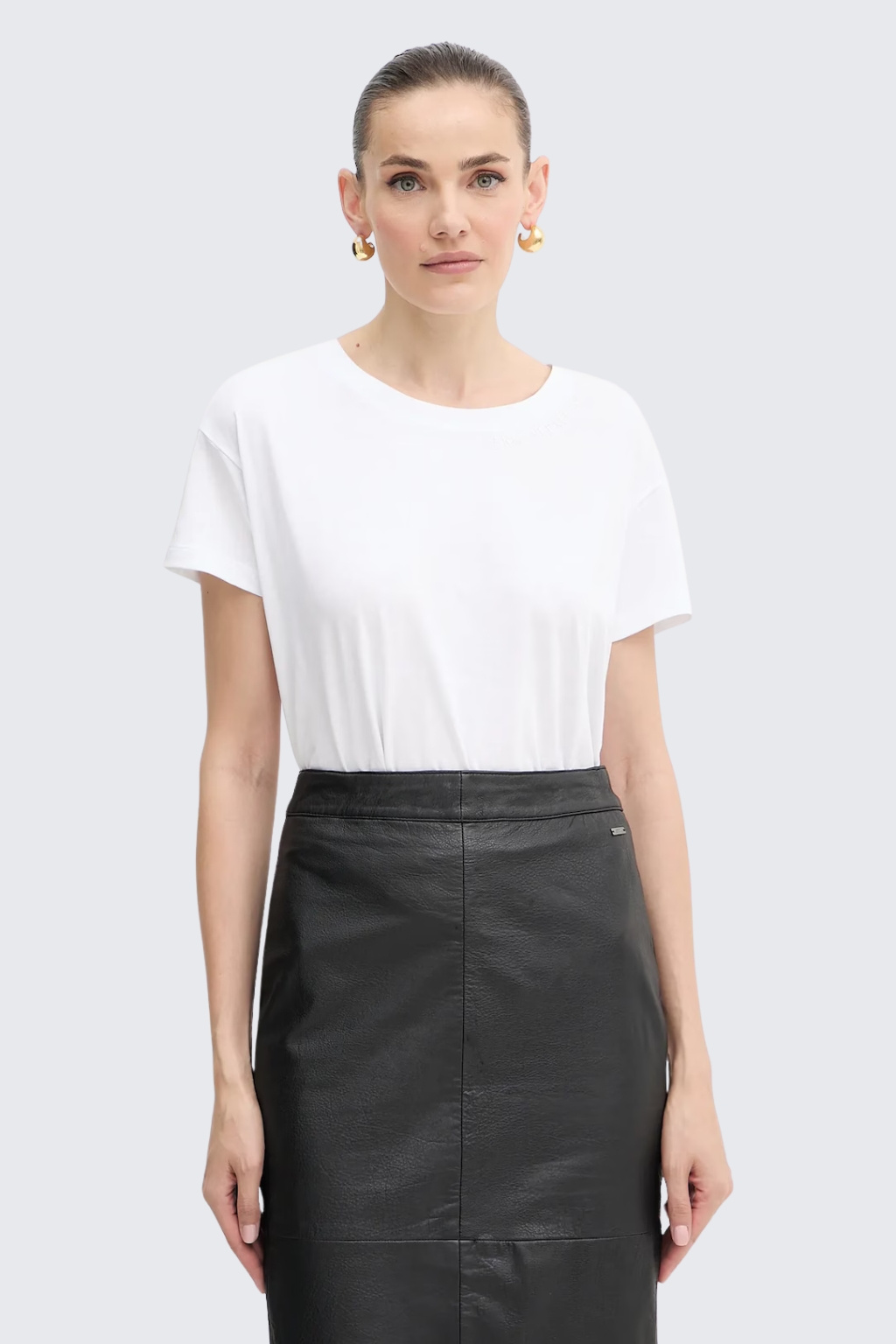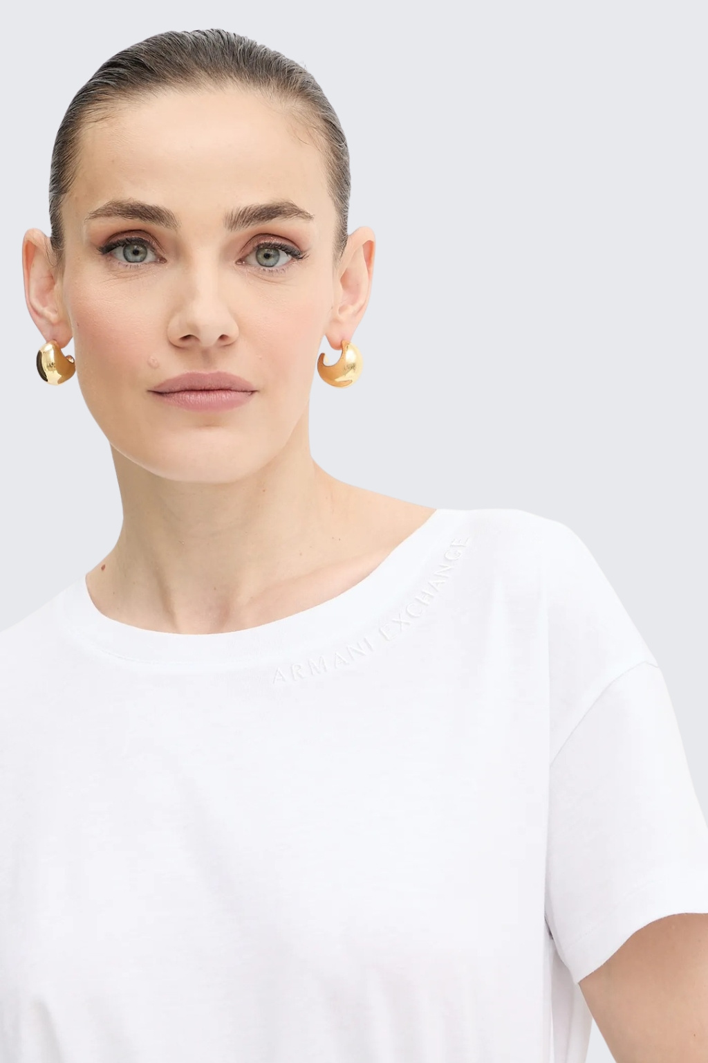 Dámské tričko značky Armani Exchange má volnější střih, krátké rukávy se sníženou linií ramen a standardní délku. Model má klasický, kulatý výstřih a podél něj je doplněný nápis značky Armani Exchange.