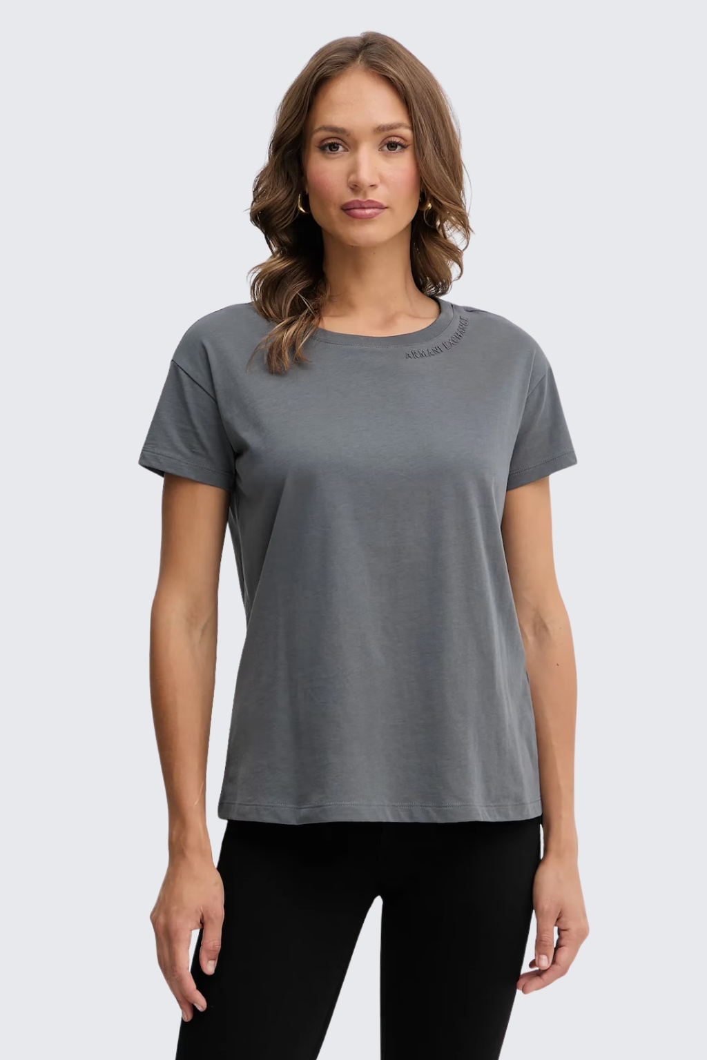 Dámské tričko značky Armani Exchange má volnější střih, krátké rukávy se sníženou linií ramen a standardní délku. Model má klasický, kulatý výstřih a podél něj je doplněný nápis značky Armani Exchange.