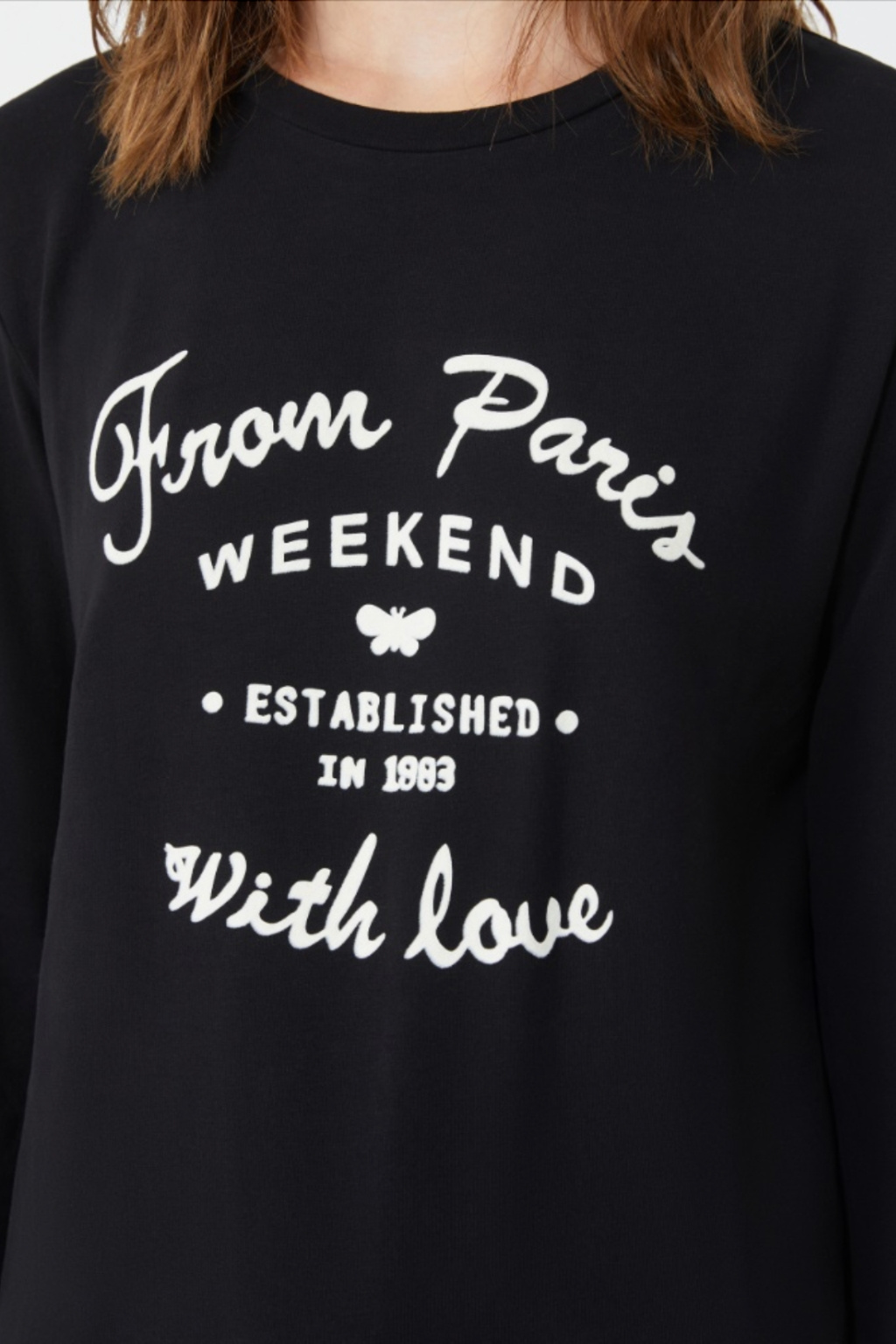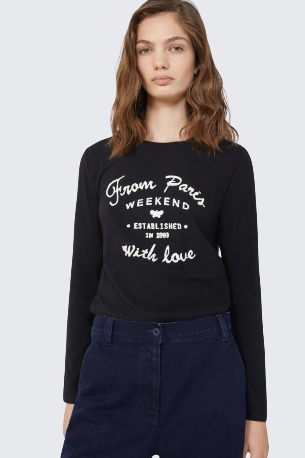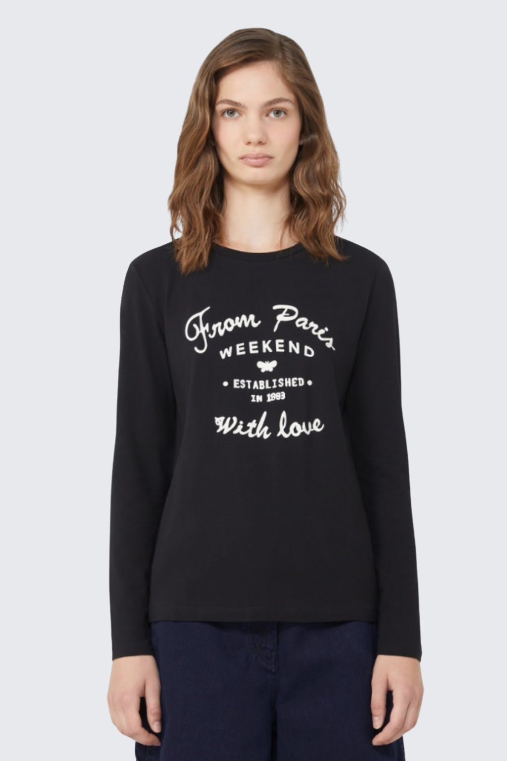 Dámské tričko značky MaxMara je s dlouhým rukávem a potiskem na přední straně. V potisku je doplněno logo a nápis MaxMara. Model je vyroben z bavlněného žeržeje a má klasický, kulatý výstřih.