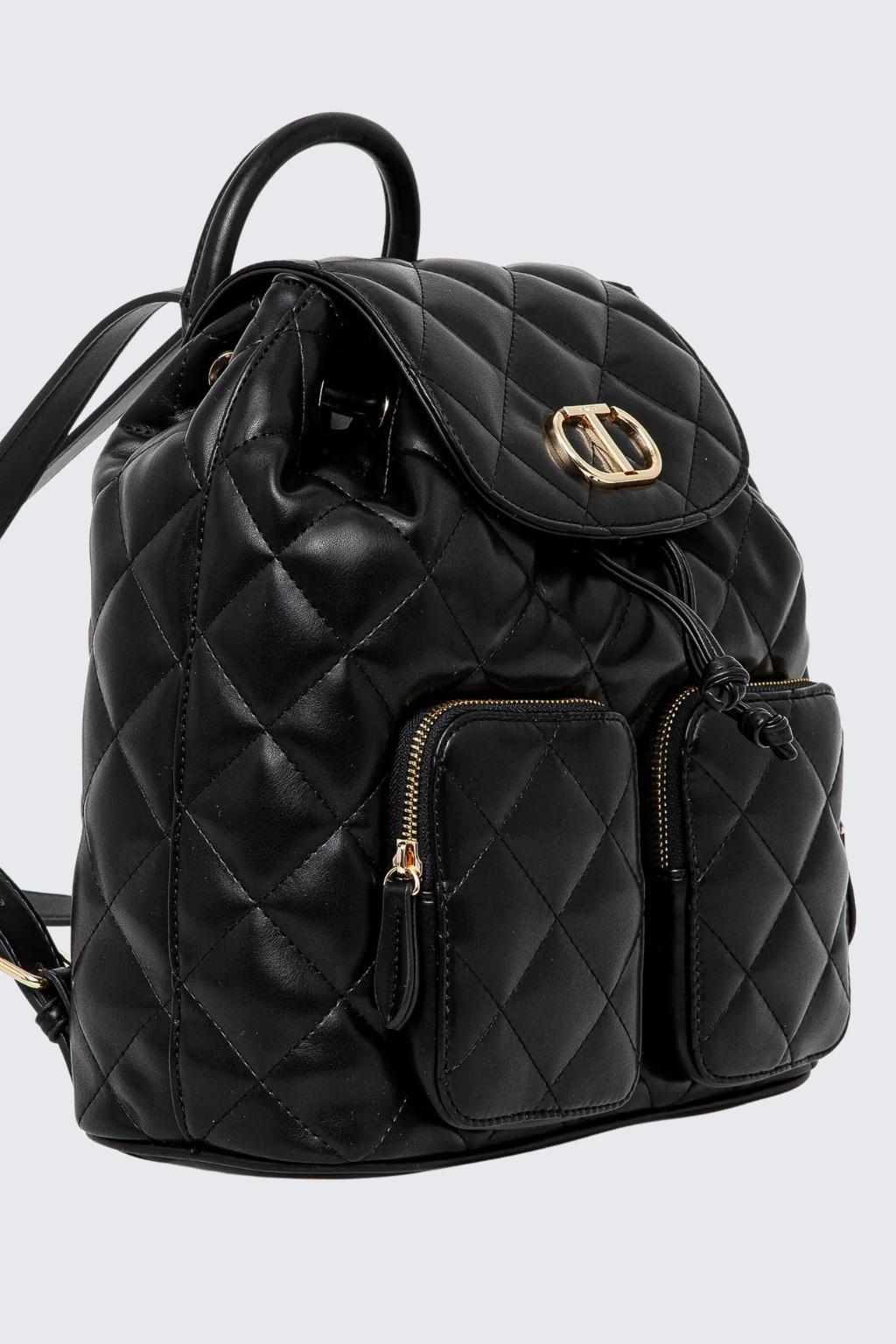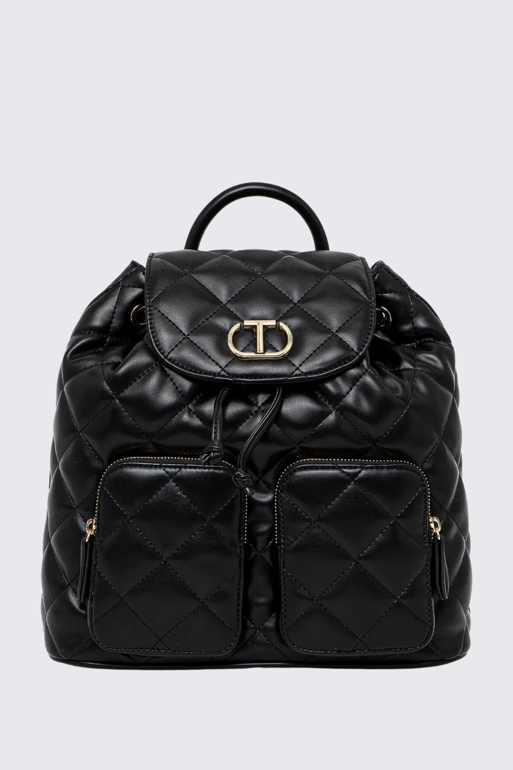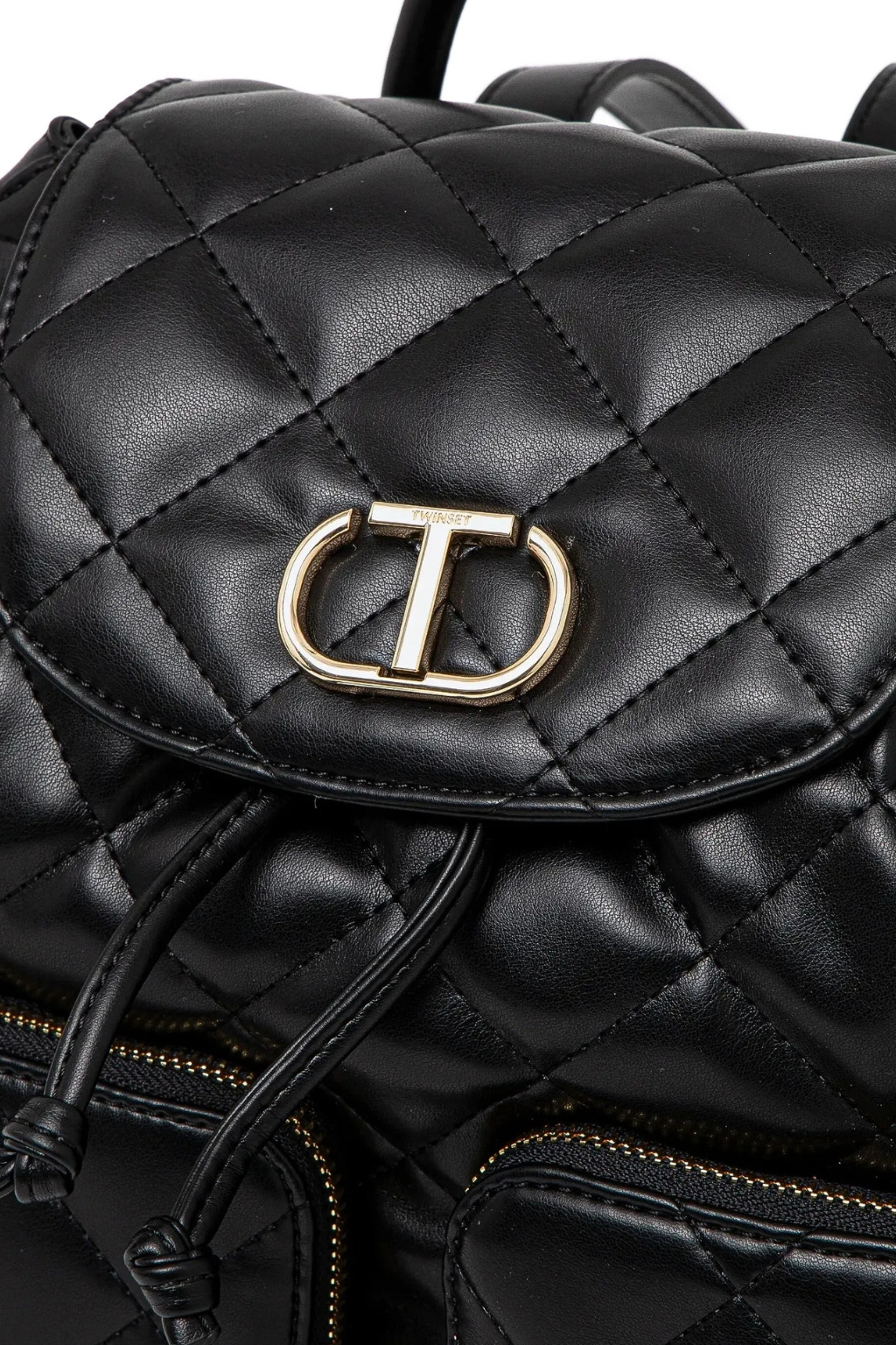 Batoh z kolekce Twinset. Model je vyroben ze syntetického materiálu. Má magnetové zapínání a komoru uzavíratelnou stahovacími šňůrkami. Na přední straně jsou kapsy na zip, uvnitř je také zapínatelná. Model je prošívaný a na horní klopě je doplněno ikonické logo značky TWINSET. Model má dva ramenní popruhy a jedno klasické ucho. Rozměry kabelky jsou 32 x 30 x 10 cm.