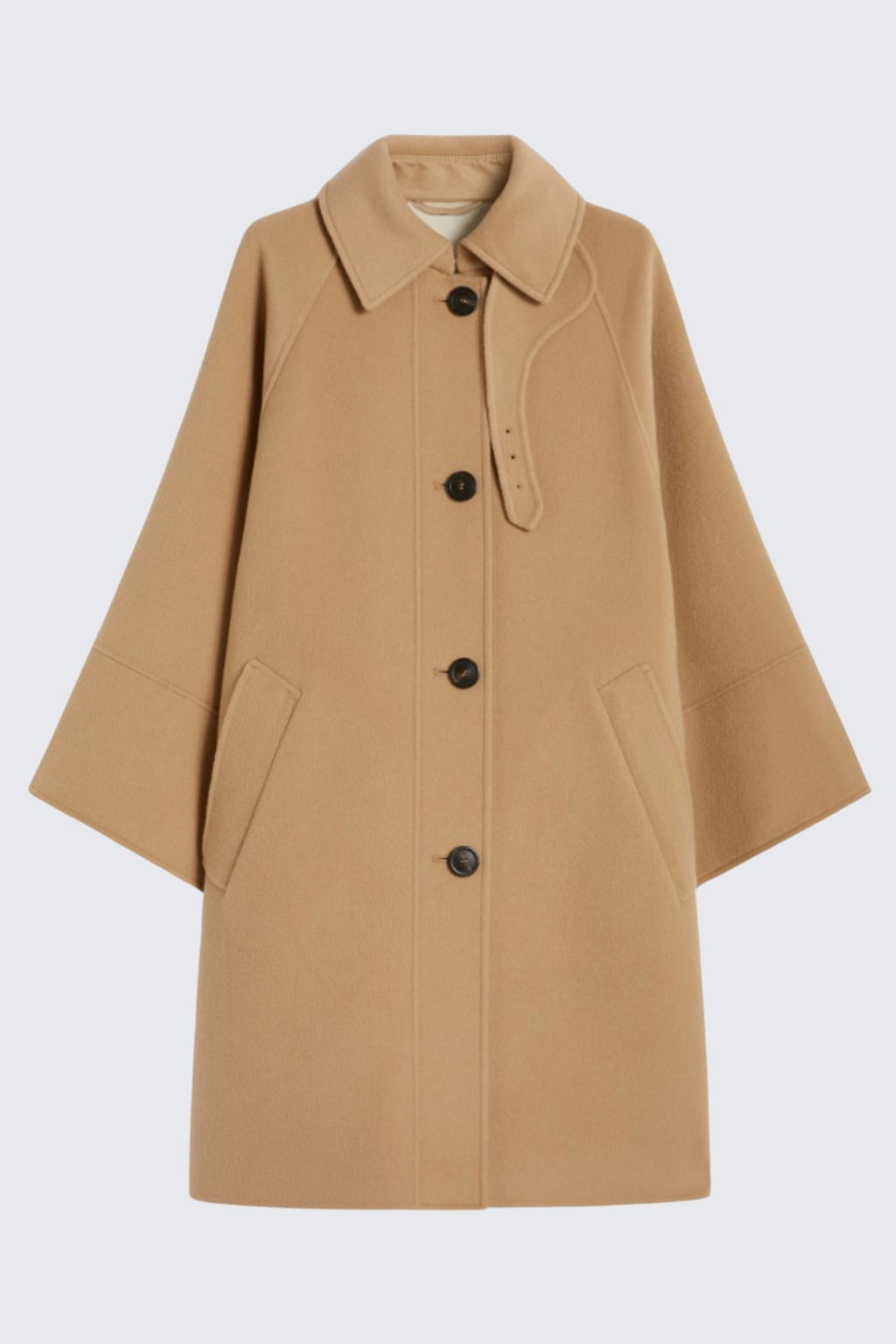 Dámský jednořadový kabát značky MaxMara má na zadní straně vodoodpudivou, prošívanou část, zbytek oděvu je vyroben z čisté vlny. Kabát má košilový límeček s páskem pod bradu a zapínání na knoflíky. Kabát má široké rukávy a boční lemované kapsy.