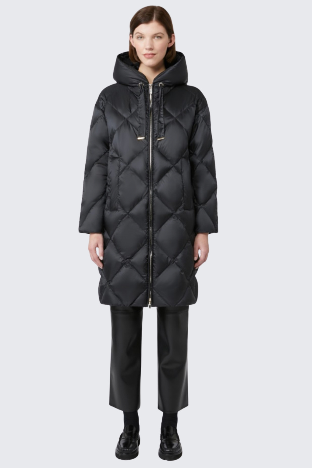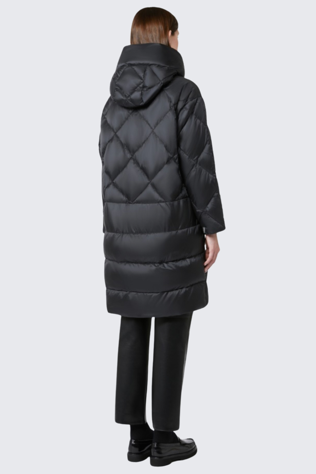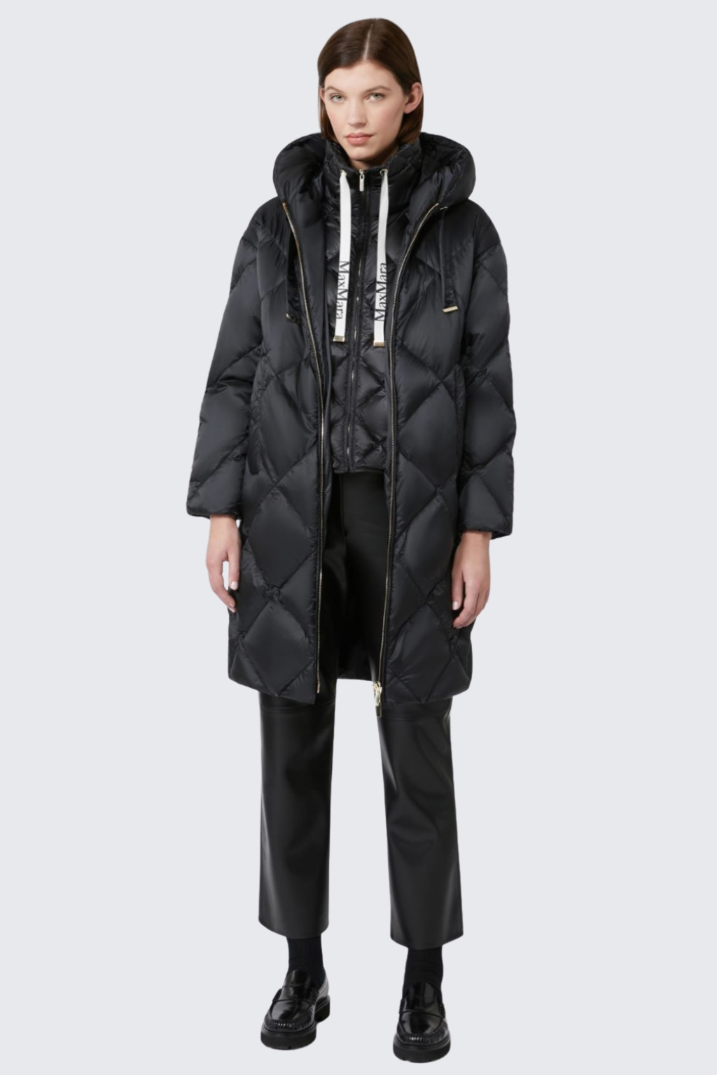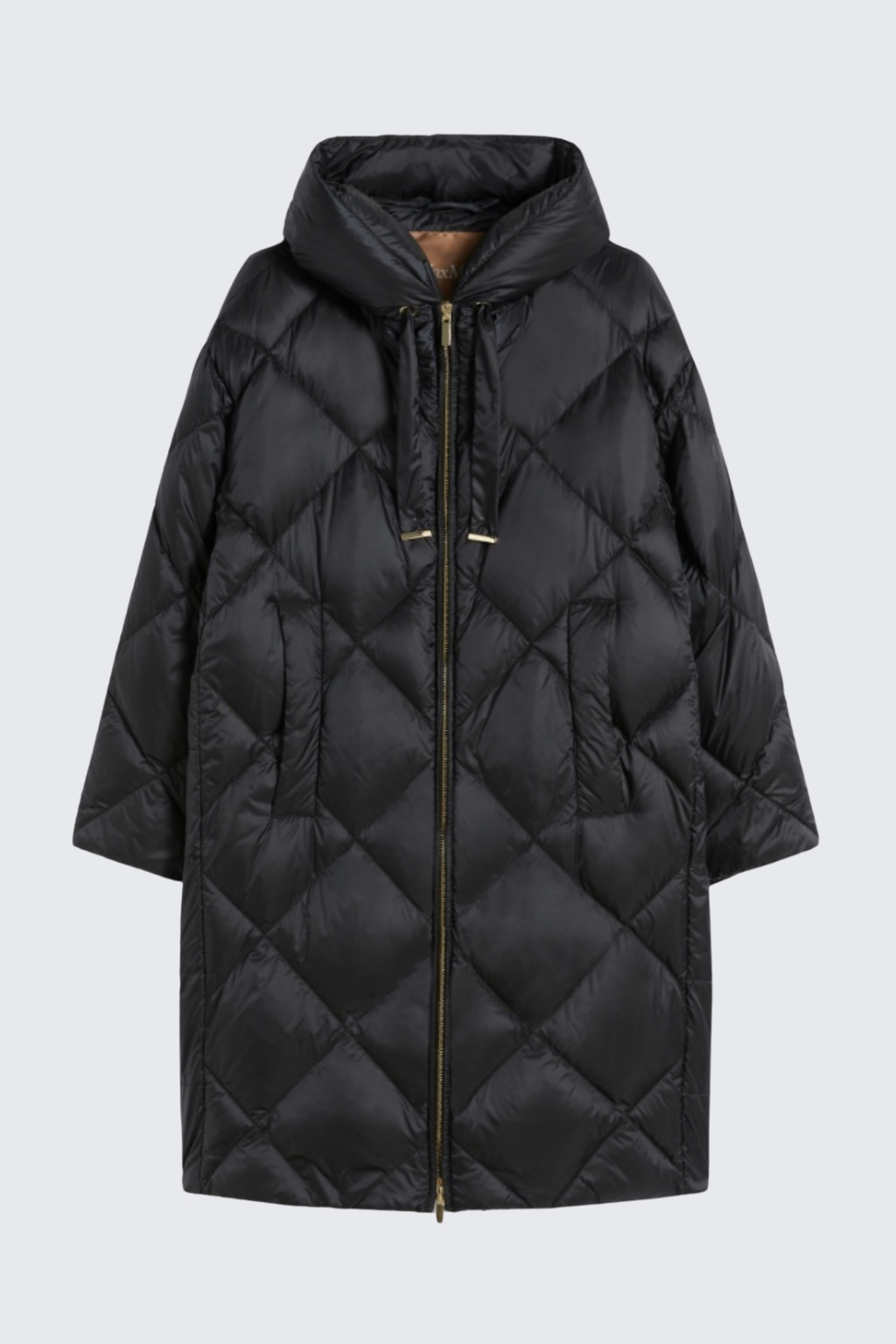 Rovný péřový kabát značky MaxMara má midi délku a volný střih. Kabát je celoplošně prošívaný diamantovým vzorem a horizontálními pruhy na zadní straně. Bunda je péřová a má kapuci se stahovací šňůrkou. Zapíná se na dvoucestný zip a má po stranách boční lemované kapsy.