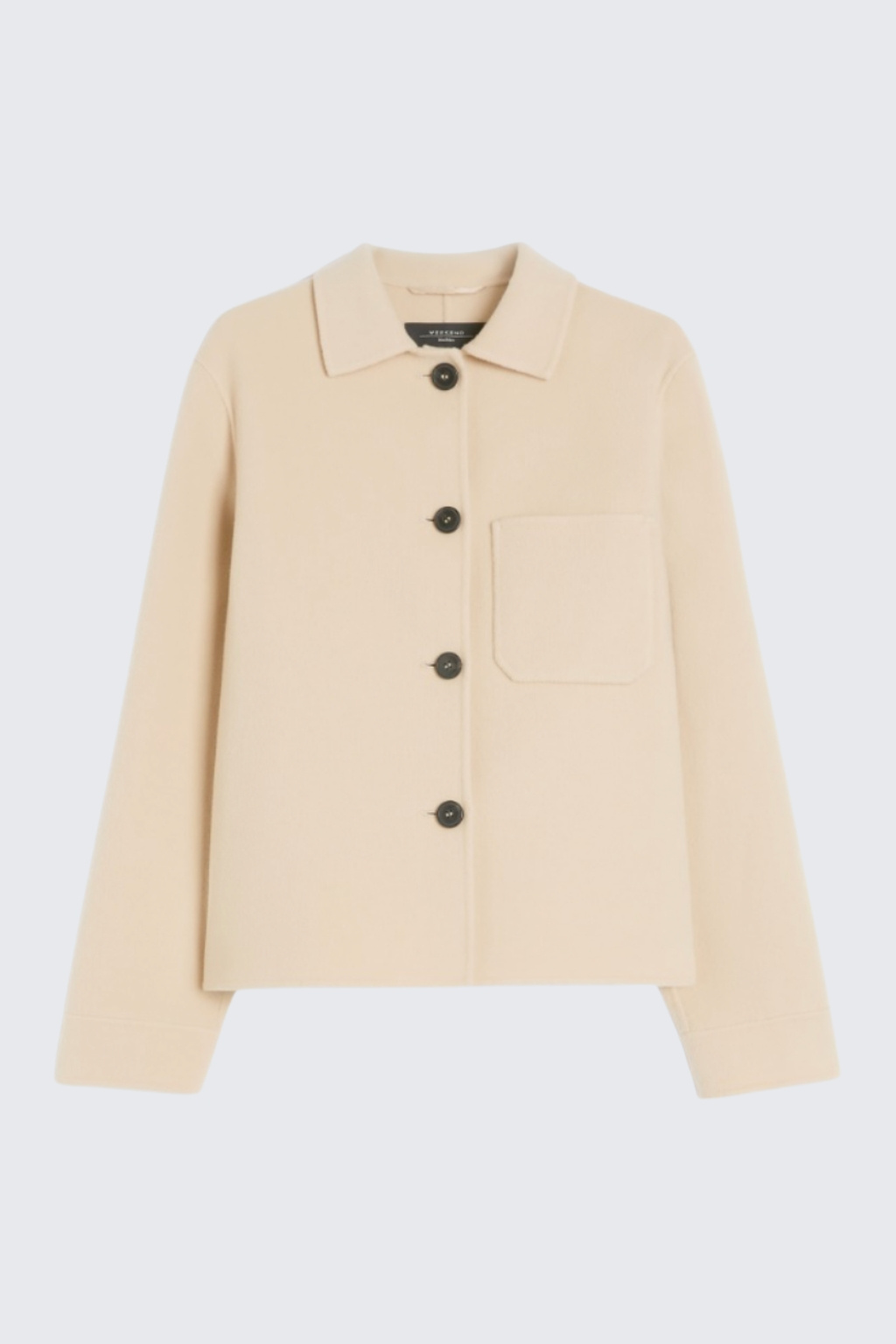 Dámský kabátek značky MaxMara má košilový, rovný střih. Model má u krku špičatý límeček a zapínání po celé délce na knoflíky. Konce rukávů jsou zakončeny žebrovanou manžetou s knoflíkem. Model má sníženou linii ramen a jednu náprsní kapsu.