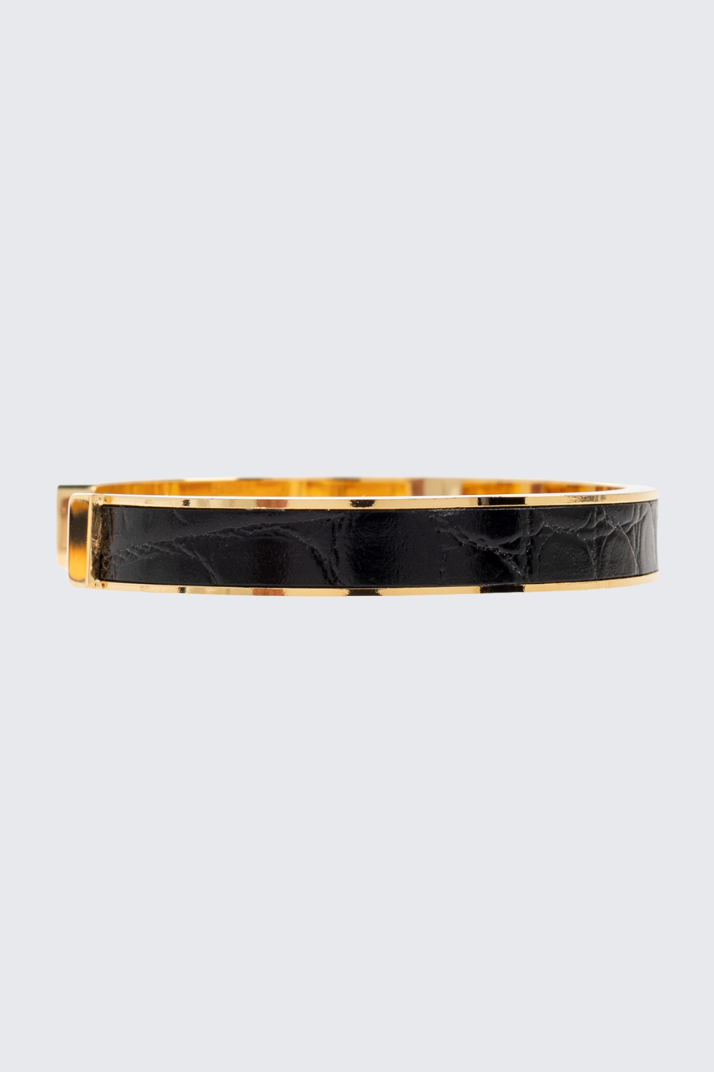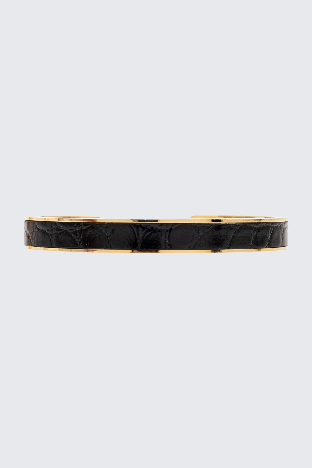 Dámský mosazný náramek značky DSQUARED2 má klasický, mírně zaoblený tvar a je vyroben z prvotřídní mosazi. Vnější stranu zdobí černý kožený motiv s jemnou texturou. Z vnitřní strany je gravírované logo značky DSQUARED2.