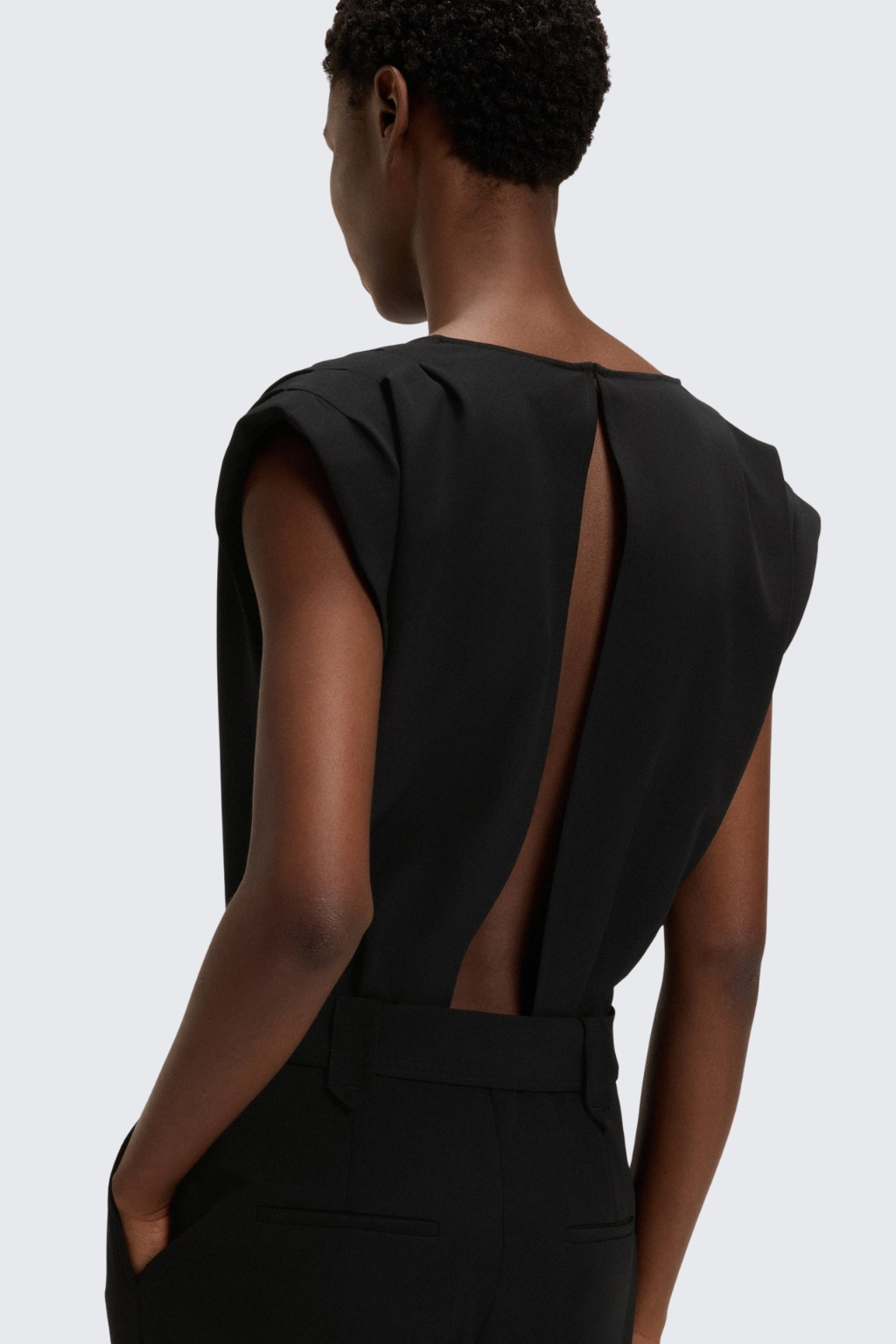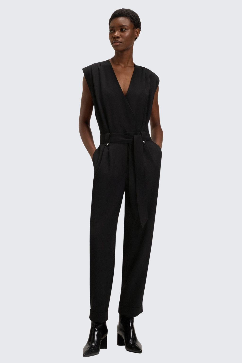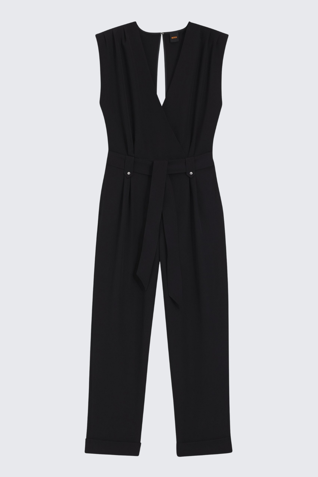 Dámský overal značky BOSS je vyroben z měkkého krepu s látkovým páskem a druky. Model má běžný střih, zavinovací efekt a výstřih do V. Overal má krátké rukávy a po stranách dvě průhmatové kapsy, na zadní straně jsou také dvě kapsy. Na zadní straně je u krku zapínání a pruh s odhalenými zády až k pasu.