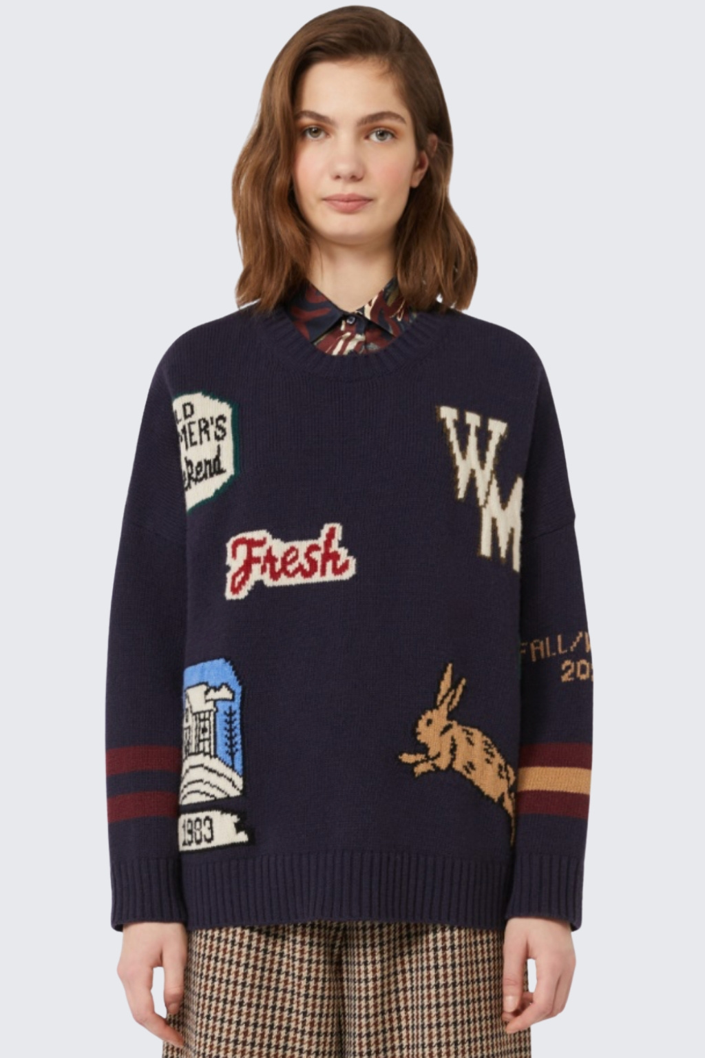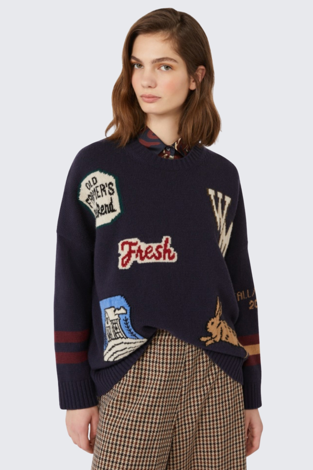 Dámský svetr značky MaxMara je volného střihu a je vzorovaný úpletem ze přední strany a na rukávech. Svetr je vyrobený z čisté vlny a má standardní délku, dlouhé rukávy se sníženou linií ramen a kulatý výstřih. Rukávy a spodní lem modelu jsou zakončeny žebrovanou manžetou.