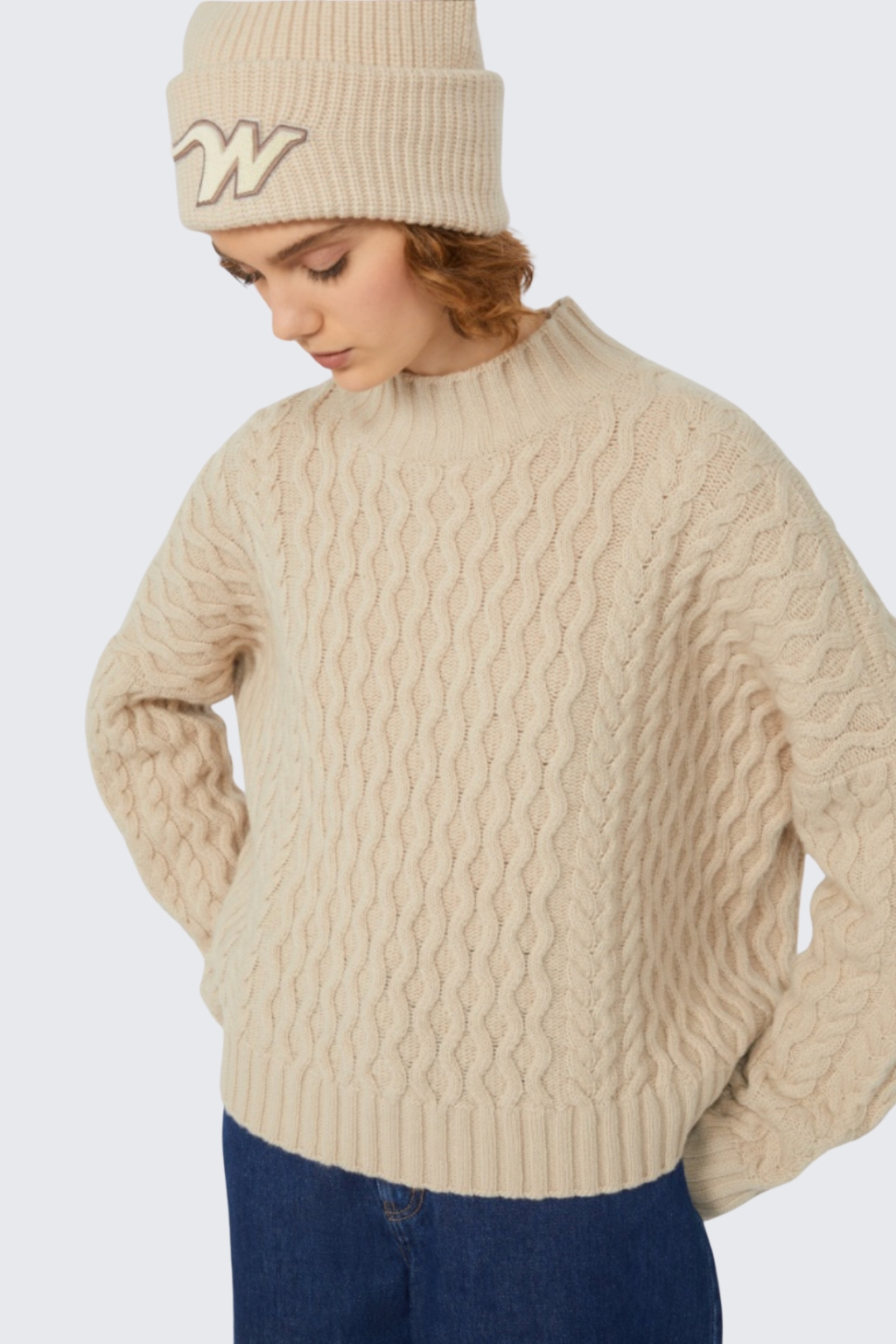 Dámský svetr značky MaxMara je volného střihu z jednobarevného copánkového úpletu. Svetr je vyrobený z čisté vlny a má standardní délku, dlouhé rukávy se sníženou linií ramen a vysoký límec. Rukávy a spodní lem modelu jsou zakončeny žebrovanou manžetou.