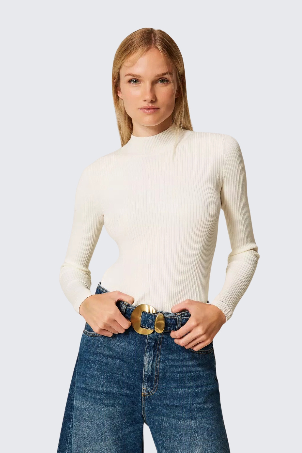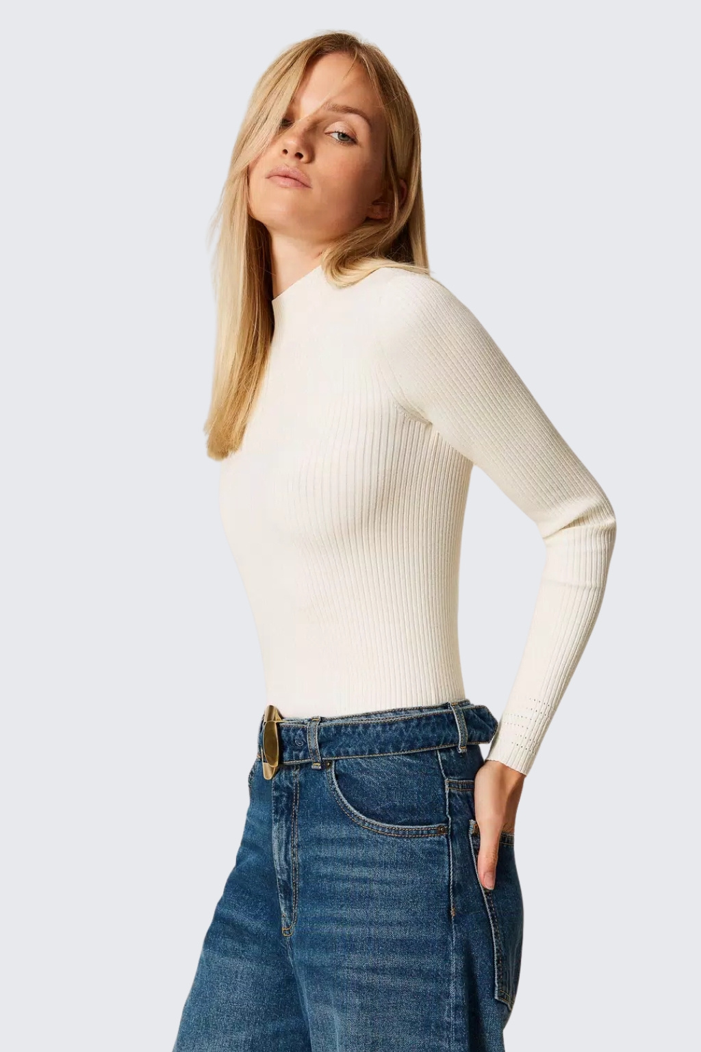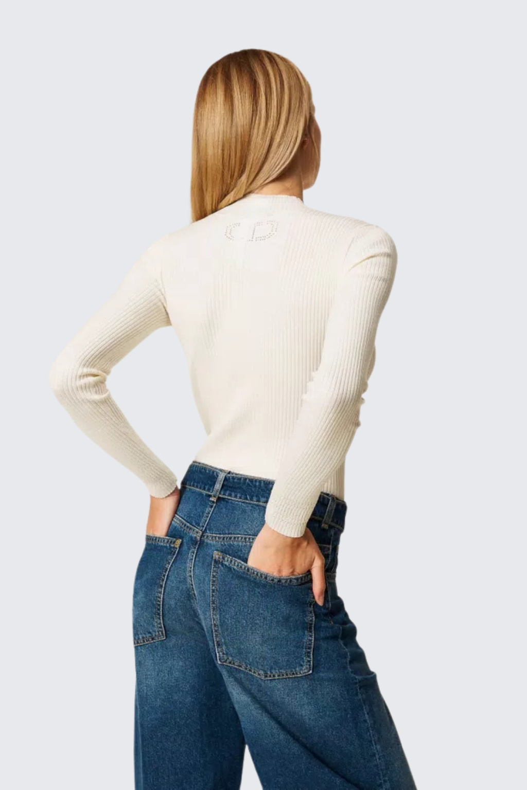 Dámský svetrový rolák značky TWINSET je vyrobený z viskozového žebrového úpletu. Model má roláček, dlouhé rukávy a přiléhavý střih. Na zadní straně je štítek s logem značky TWINSET.