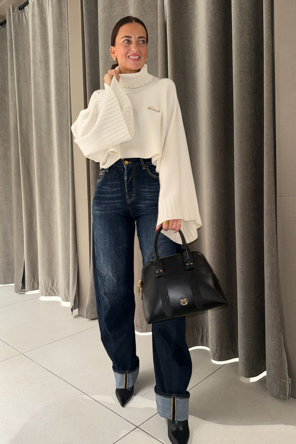 Dámský svetr značky TWINSET je vyroben z pleteniny. Má volný střih, vysoký límec, zkrácenou délku do pasu a dlouhé raglánové rukávy s žebrovanou manžetou vespod. Model má na hrudi brož s logem značky TWINSET.