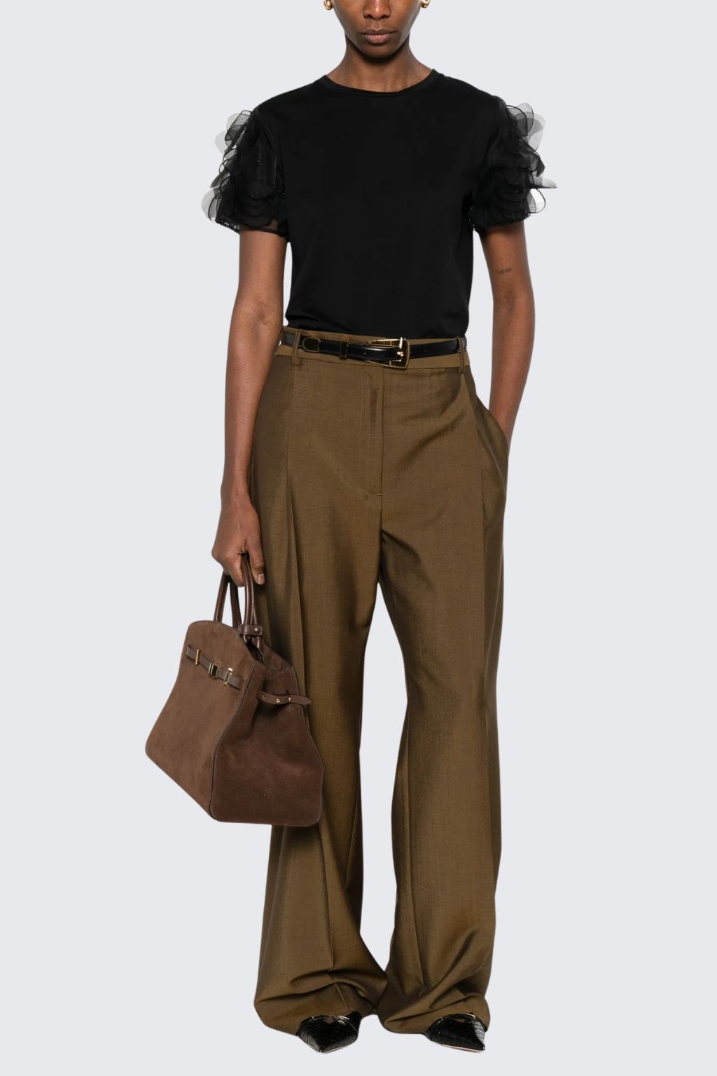Dámský top značky MaxMara má standardní délku a přiléhavý střih. Model má krátké rukávy a klasický, kulatý výstřih. Na rukávech jsou vsadky, které vytváří nabíraný dojem.