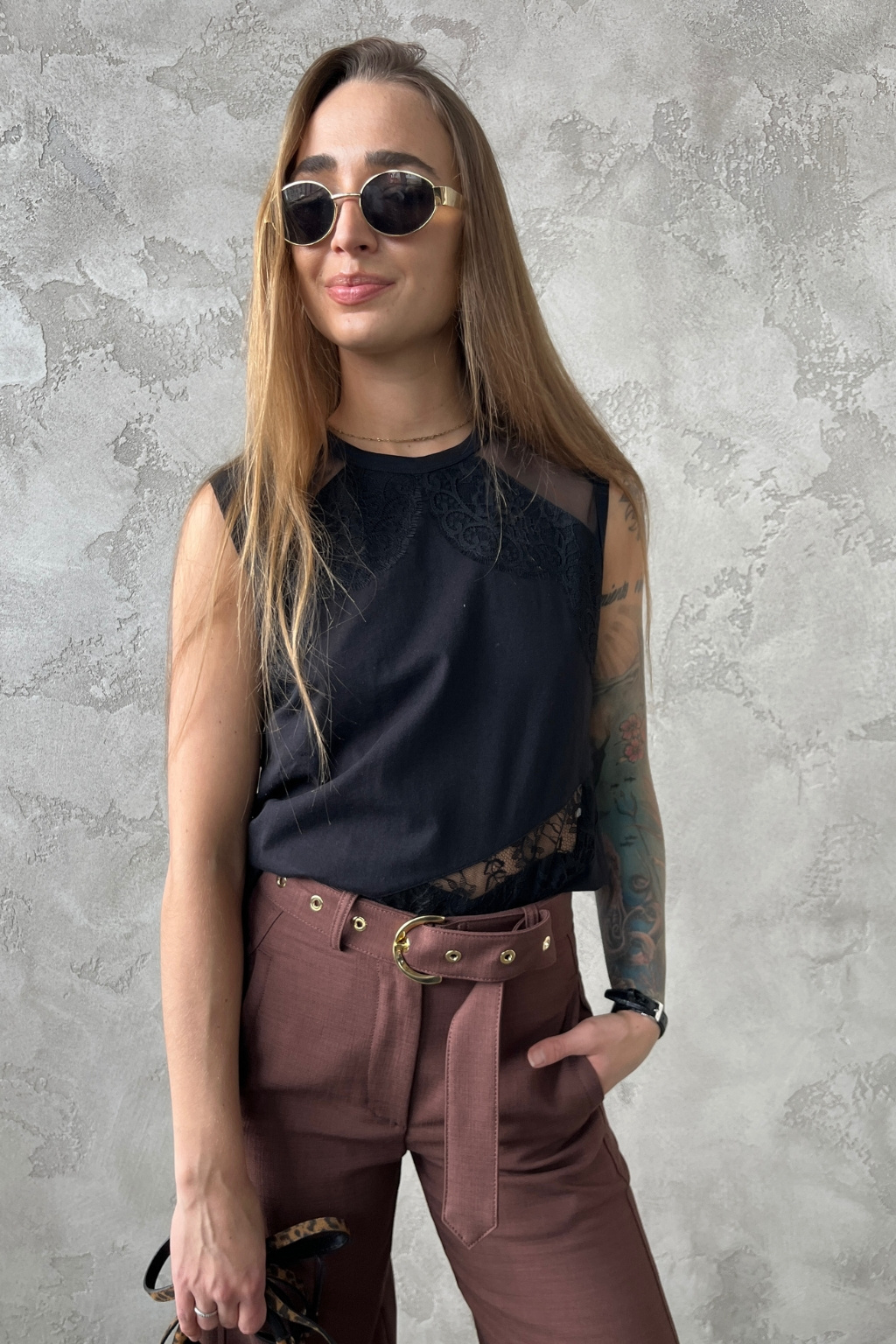 Dámský top značky PINKO má standardní délku a střih bez rukávů. Má kulatý výstřih a průsvitné vsadky s krajkovými detaily.