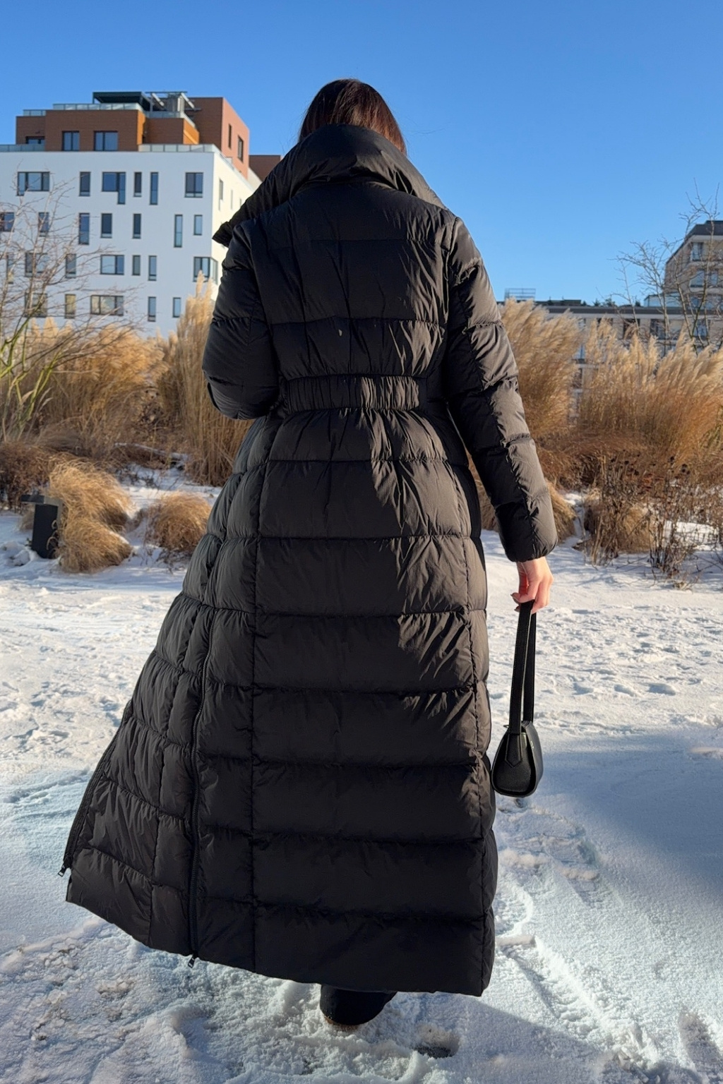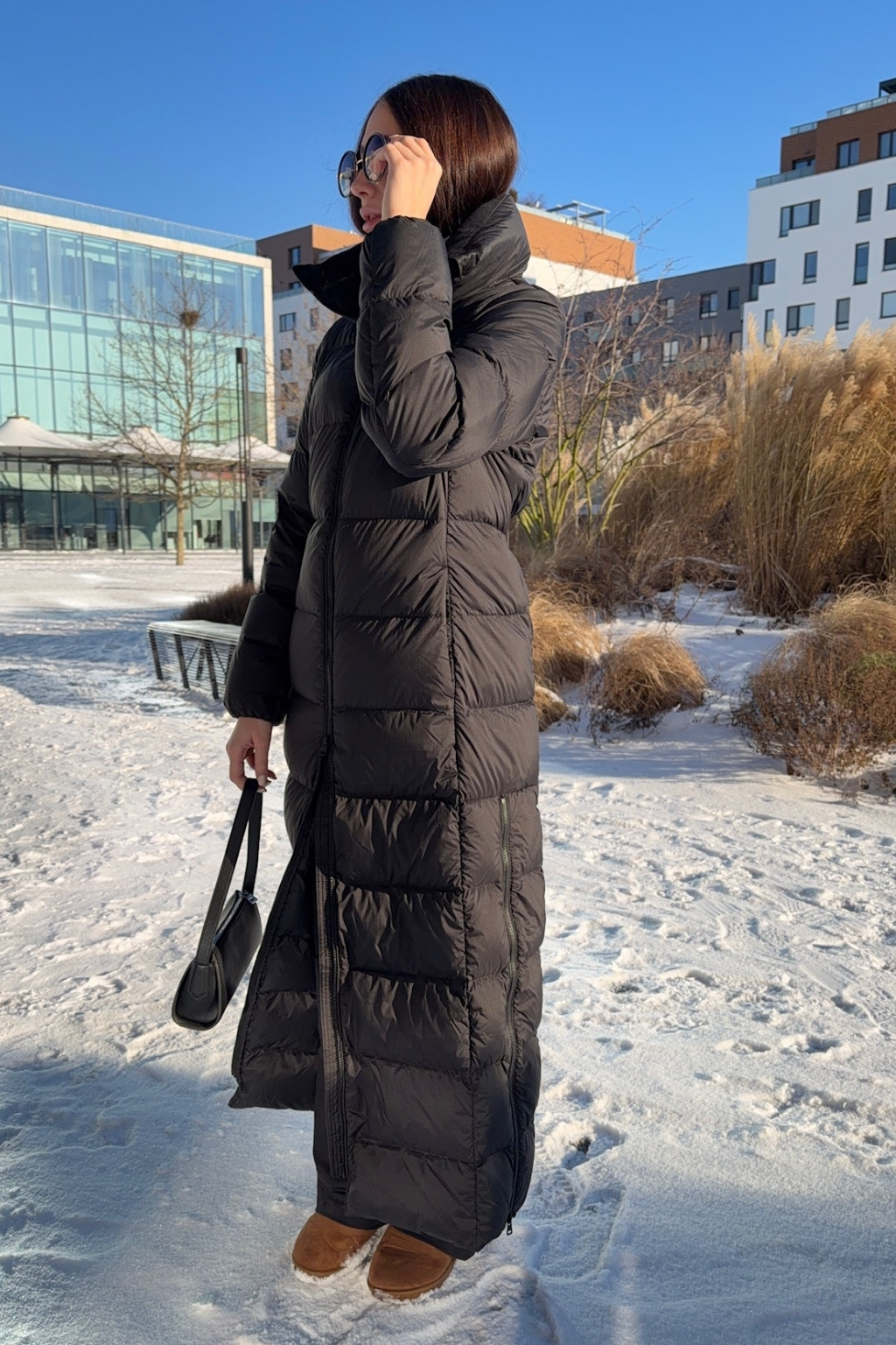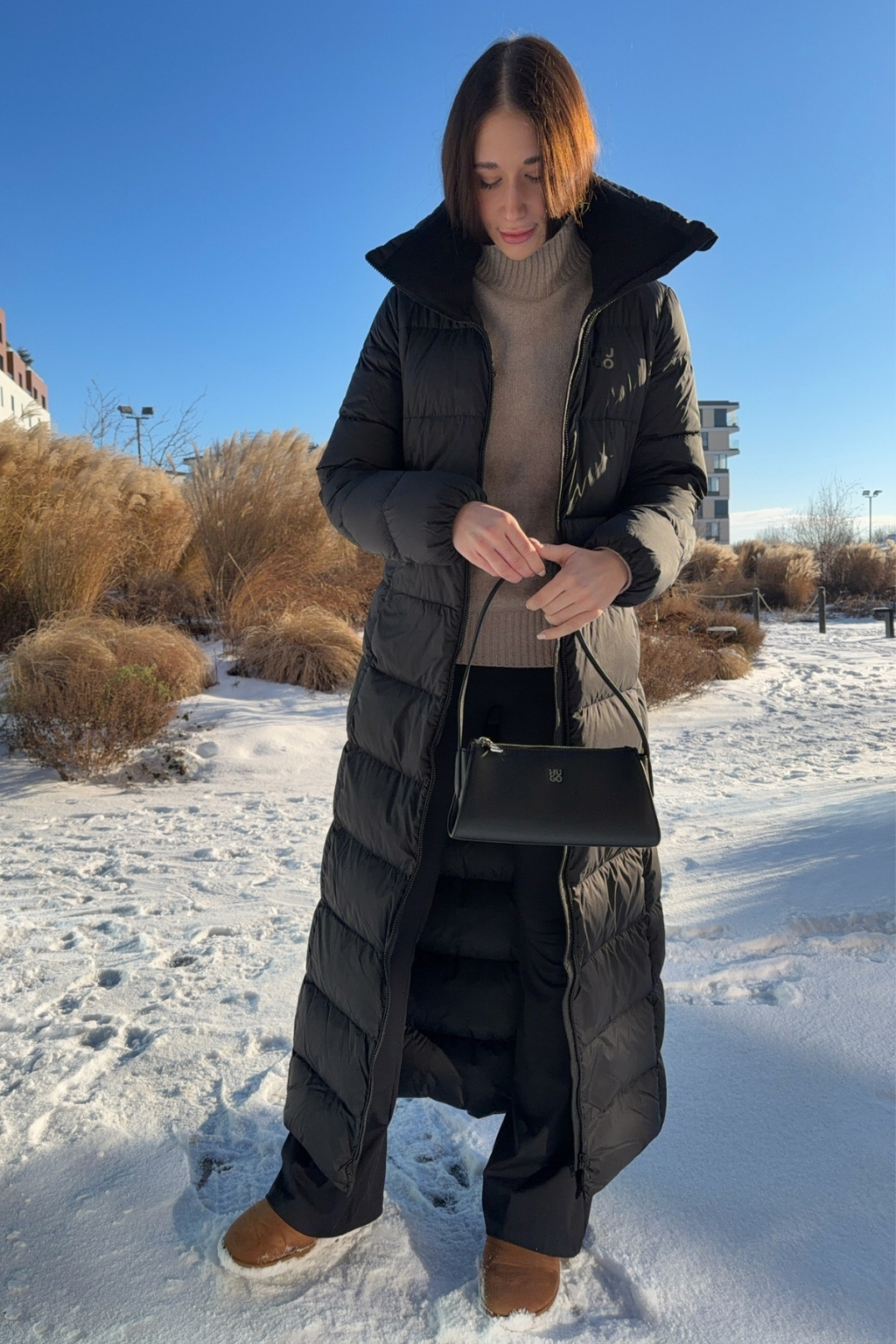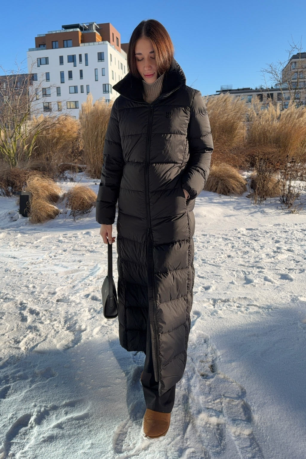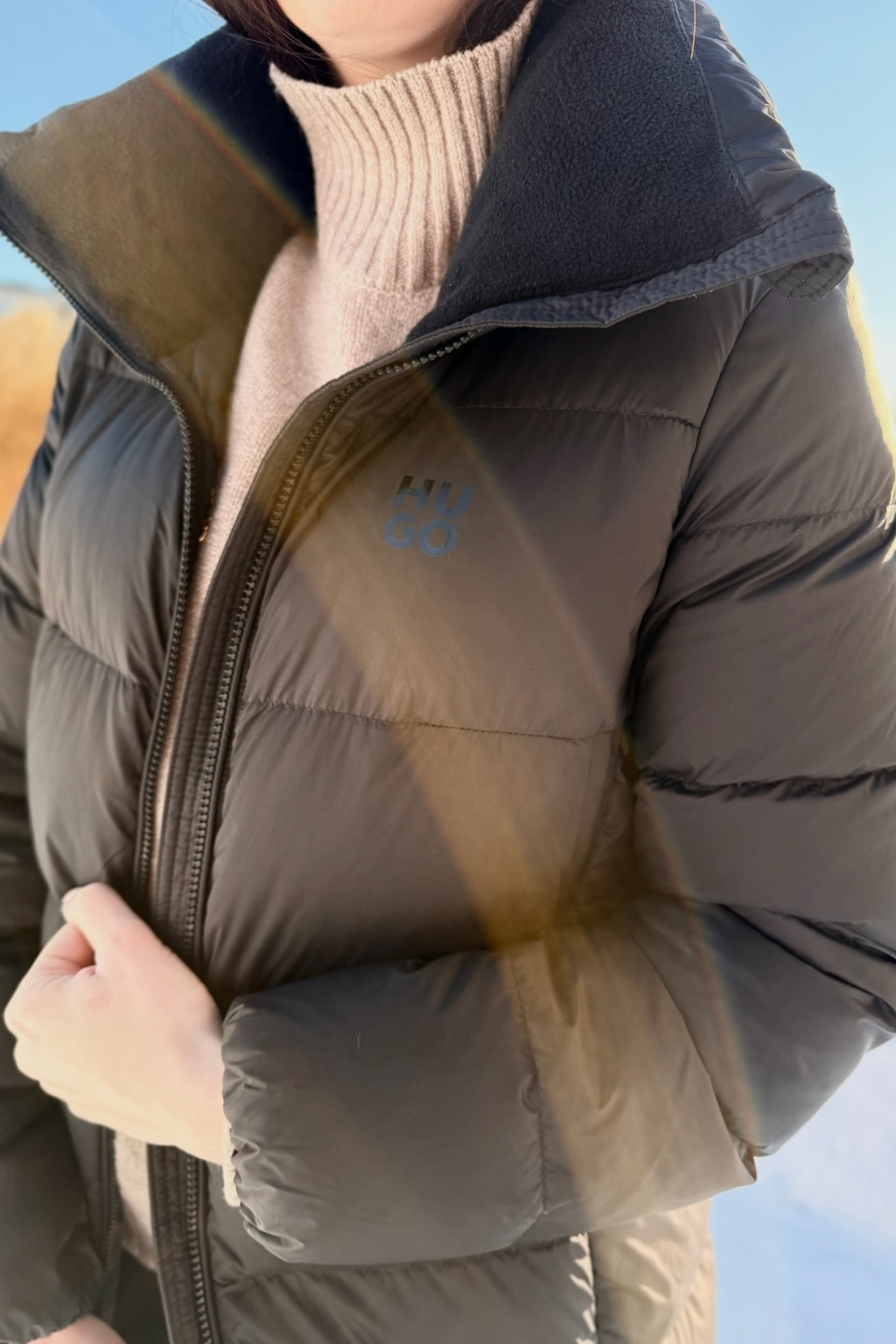 Dámský péřový zimní kabát značky HUGO má délku ke kolenům, přiléhavý střih a vysoký límec. Model má zapínání po celé délce na dvoucestný zip a vodorovné prošívání. Na hrudi je vlevo doplněno malé logo značky HUGO. Po stranách jsou vespod rozparky na zip.